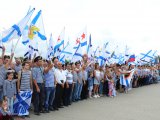 На площади, где участники парада выстроились в шеренги, торжественно вынесли флаги военно-морского флота.