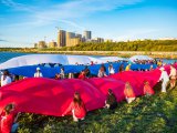 Несколько десятков юных активистов и неравнодушных челнинцев развернули у берега Камы многометровый триколор.