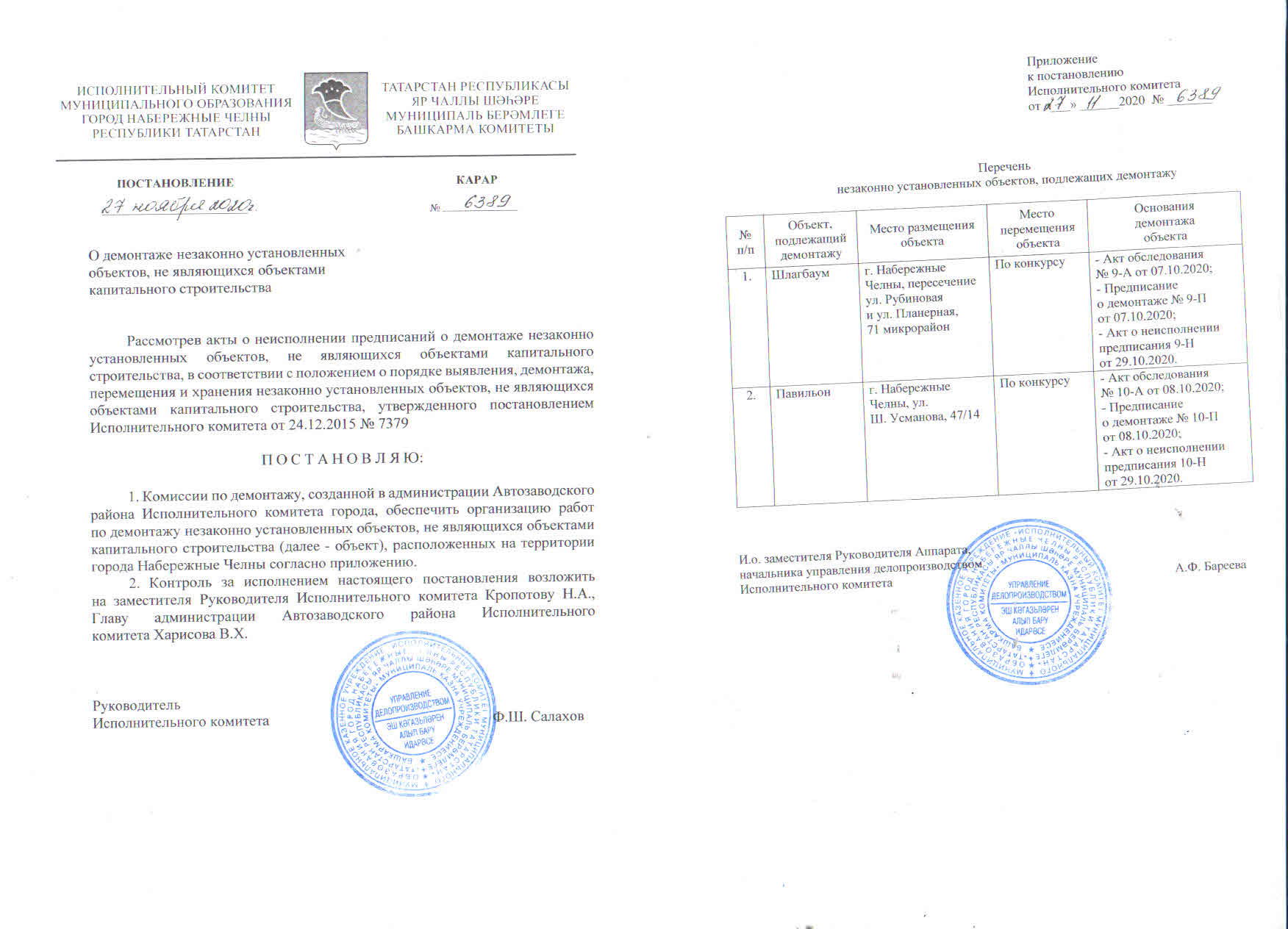 Постановление о демонтаже незаконно установленных объектов, не являющихся объектами капитального строительства от 27.10.2020 №6389