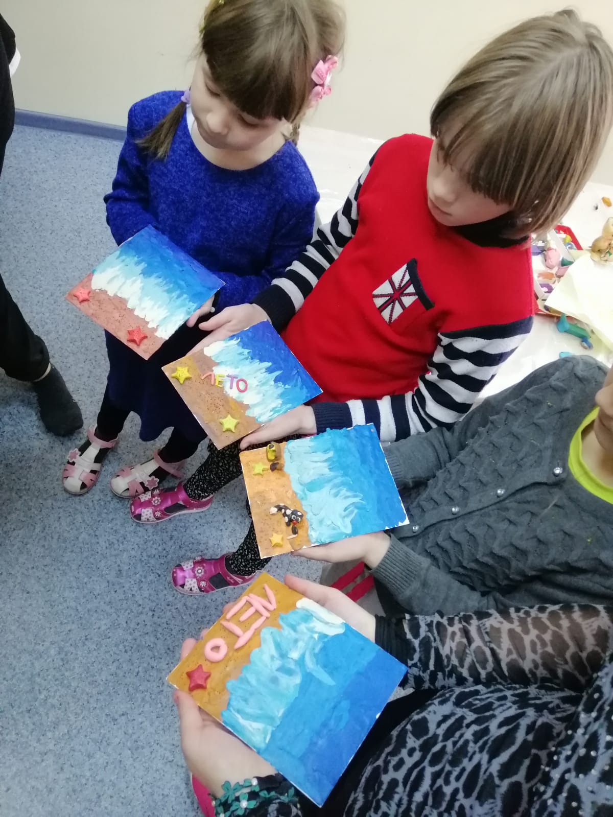 Ребята смастерили объемные картины из пластилина, посвящённые тематике лета.