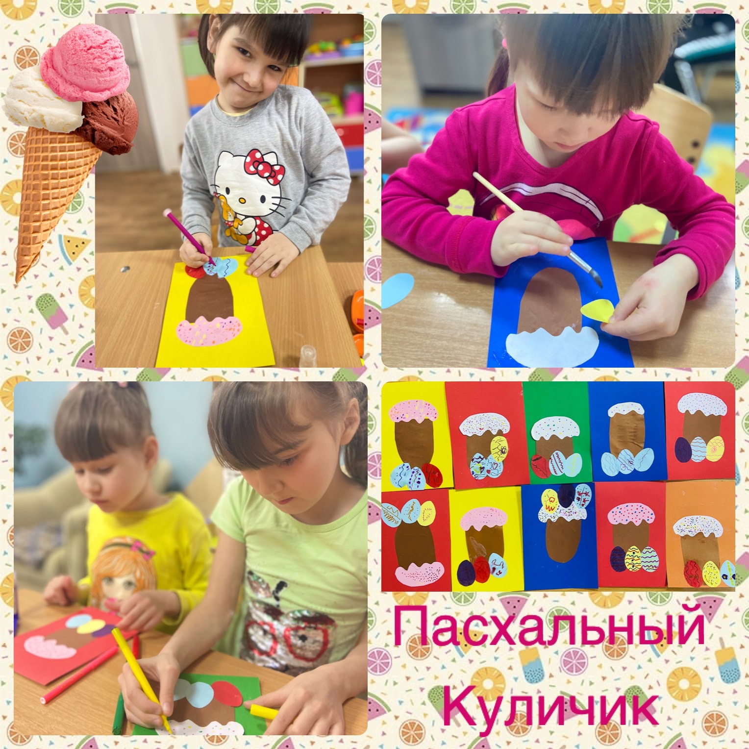 Дети с удовольствием сделали аппликацию «Пасхальный кулич», а ещё и расписывали яйца.