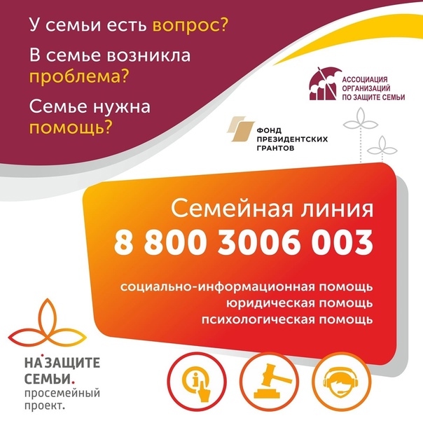 В рамках проекта на все субъекты РФ открыт федеральный номер Семейной линии 8-800-3006-003, который работает ежедневно и круглосуточно. Заявителям предлагают безвозмездную социально-информационную, консультационную, юридическую и иную помощь.
