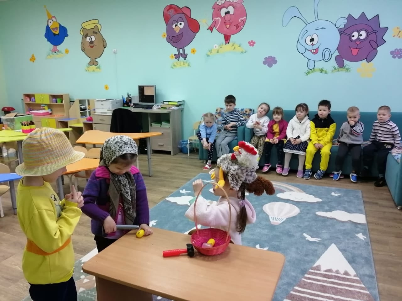 Воспитанники прослушали сказку "Курочка Ряба", выполнили артикуляционную и пальчиковую гимнастику "Гуси", "Курочка", "Коровка" для развития мелкой моторики пальцев рук. Для развития сенсорных способностей и тактильных анализатор, экспериментированию с разными материалами, маленьким воспитанникам было предложено поиграть с фетровыми фигурками по мотивам сказки. А старшие дошкольники закрепили цикл занятий "Домашние животные", показом сказки "Курочка Ряба".