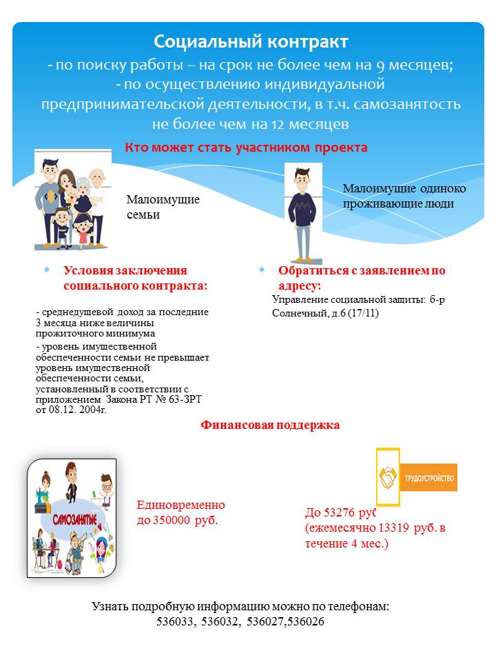 Таким образом, социальный контракт представляет собой сотрудничество между Управлением социальной защиты и заявителем по реализации программы социальной адаптации в целях максимальной адаптации заявителя и членов его семьи, повышения денежных доходов семьи и выхода на самообеспечение.