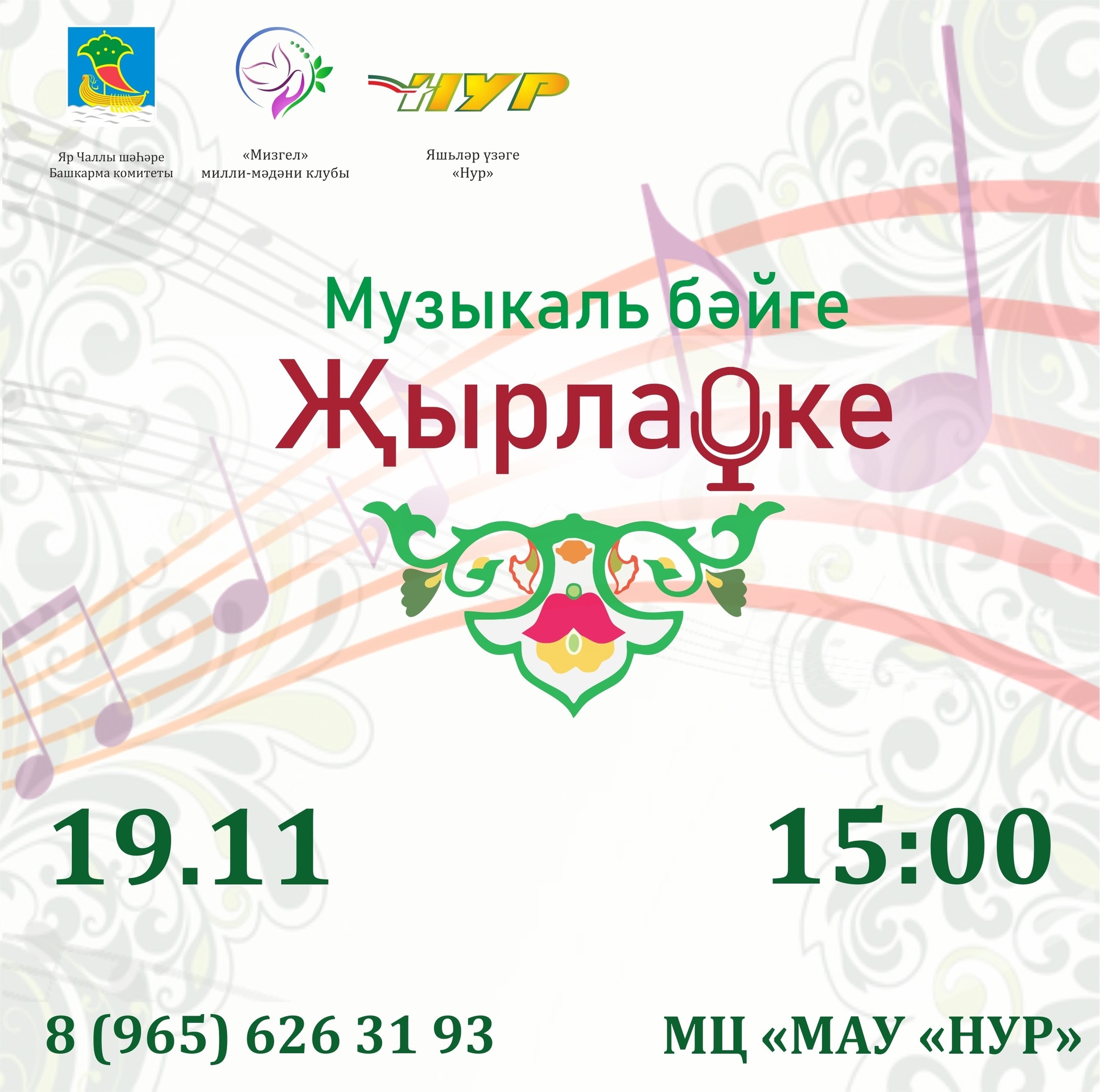 19 ноябрь көнне «Нур» яшьләр үзәгендә 15:00 сәгатьтә «Җырлаоке» музыкаль конкурсы узачак. Конкурсның максаты – татар музыкасы турындагы белемнәрне иҗади процесс аша тирәнәйтү.
