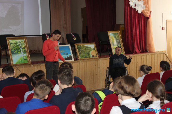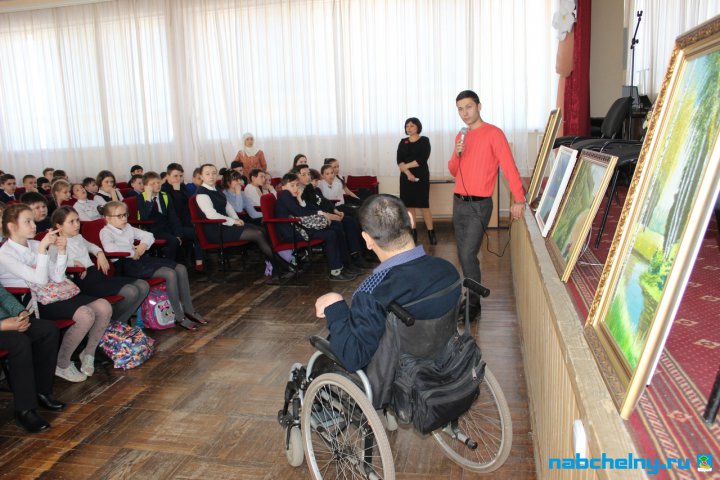 Мәктәпнең актлар залы тулы иде. Балаларга рәссамның ничек яшәве һәм ничек иҗат итүе турында кызыклы мәгълүматлар җиткерелде. Ренат Мусинның иҗат юлын башлап җибәрүе, кулсыз көе рәсем ясарга өйрәнүе аларда зур кызыксыну уятты. Рәссамның спорт белән шөгыльләнүе, шашка уйнавы, төрле ярышларда һәм конкурсларда катнашуы да балалар игътибарыннан читтә калмады. Барлык кыенлыкларга да карамастан, рәссам актив сәламәт яшәү рәвеше алып бара, башкаларга да шуны киңәш итә. Яшь буынны үз хыялларын тормышка ашырырга, авырлыклардан курыкмаска, сынауларга бирешмичә алга барырга өнди ул.