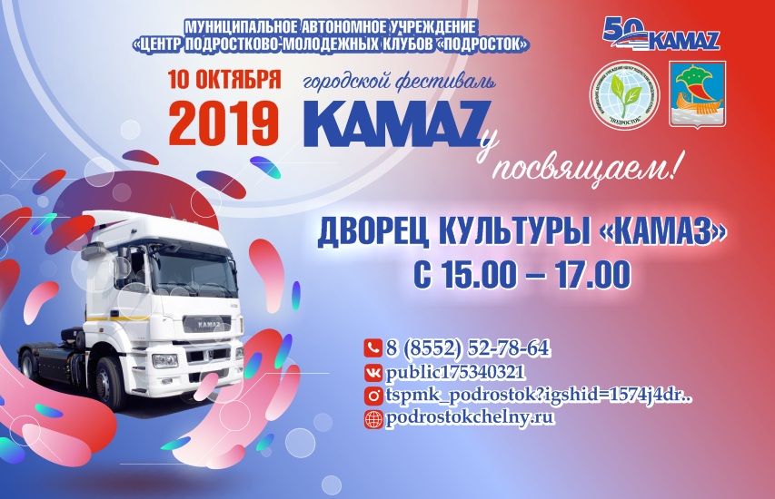 10 октября во дворце культуры "КАМАЗ" состоится городской фестиваль "КАМАЗу посвящаем!". В рамках мероприятия будут организованы выставка работ изобразительного искусства и декоративно-прикладного творчества; мастер-классы от лучших педагогов и специалистов центра «Подросток»; интерактивные площадки; состоится награждение победителей городского конкурса - выставки декоративно-прикладного творчества «КАМАЗ – это сила и мощь!» и регионального конкурса рисунка «КАМАЗу-50»; флешмоб.