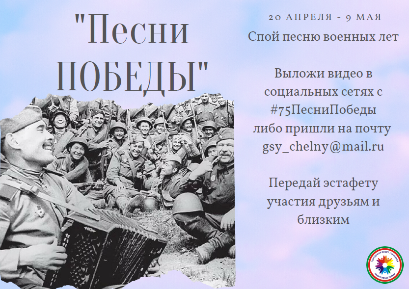 С 20 апреля Городской совет учащихся запустил онлайн-акцию «Песни Победы». Участникам необходимо записать видео исполнения песни военных лет вместе со своей семьей. Затем выложить ролик в Инстаграм или в группу Вконтакте с хештегом #75ПесниПобеды, либо прислать на почту Городского совета учащихся – gsy_chelny@mail.ru. Лучшие видео будут опубликованы в официальных аккаунтах ГСУ. Принять участие в онлайн-акции может любой желающий.