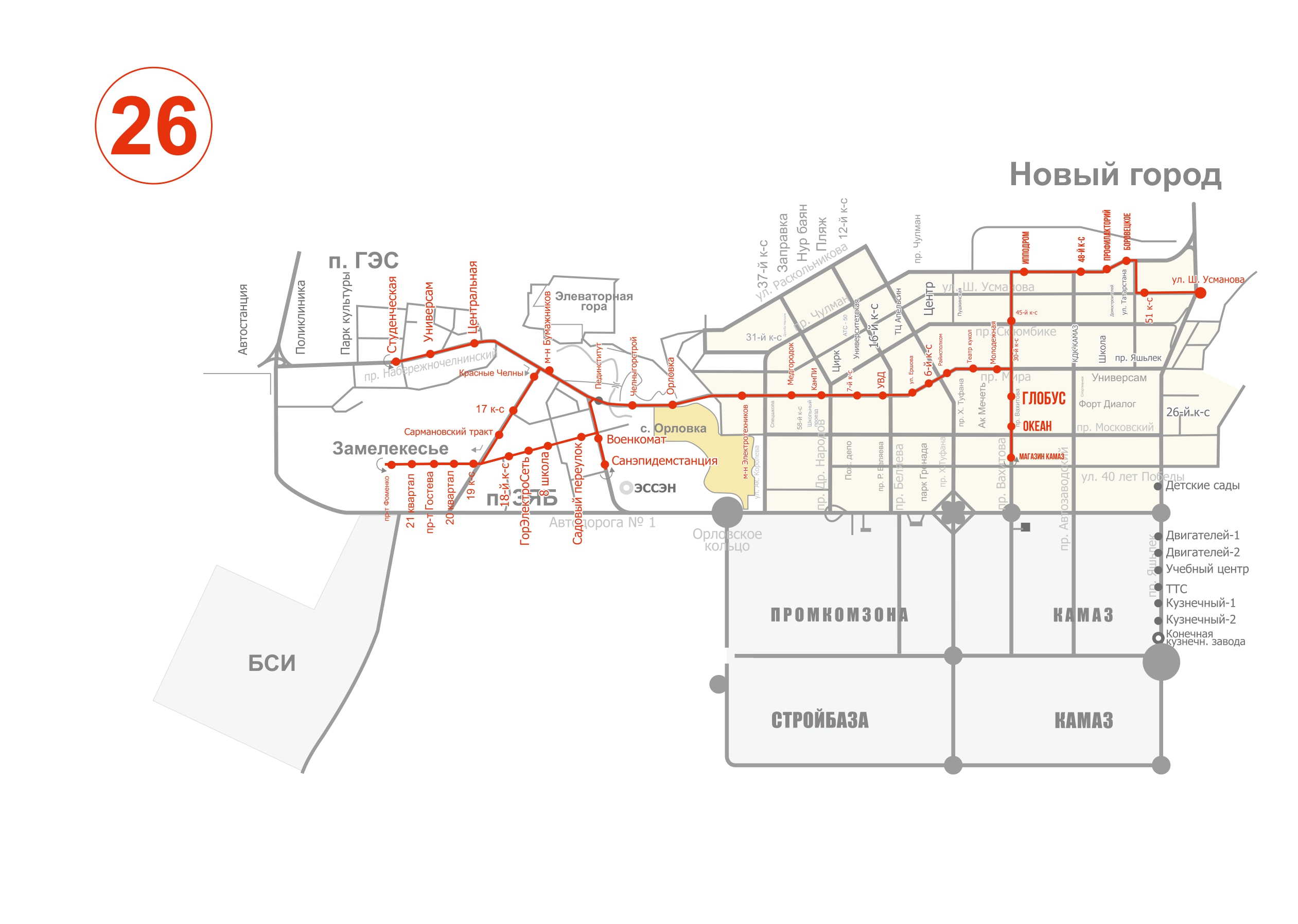 ГЭС поселогыннан 26 маршрут автобуслары «Студентлар урамы», «Универсам», «Үзәк» тукталышлары аша йөриячәк, аннары автобус Сарман трактыннан, «Кызыл Чаллы», «17 комплекс» тукталышлары аша, Фоменко проспектына чыгып хәрәкәт итәчәк. Алга таба үзгәрешләрсез.
