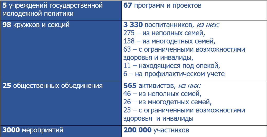Молодежная политика в городе реализуется по 13 основным направлениям. В городе функционируют 9 учреждений молодежной политики. Для выполнения поставленных задач развивается и максимально используется имеющаяся инфраструктура учреждений молодежной политики, в которой функционируют: 4 молодежных центра, 28 подростковых клубов, из которых 3 ждут реконструкции, 14 хоккейных кортов, 4 социальных учреждения. По программе капитального ремонта и укрепления материальной базы в течение 7 лет произведен капитальный ремонт 25 подростковых клубов, проведена реновация двух молодежных центров,обновлена материально-техническая база, созданы новые креативные пространства.