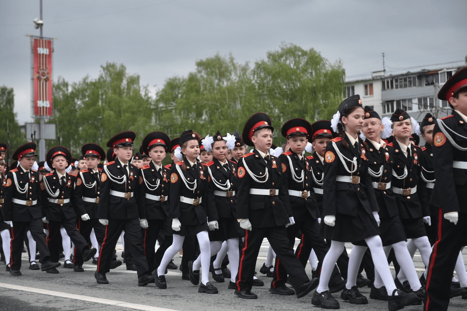 Марш возглавила группа мажореток парадно-строевого расчета Кадетской школы №82 имени героя Советского Союза Ильдара Маннанова.