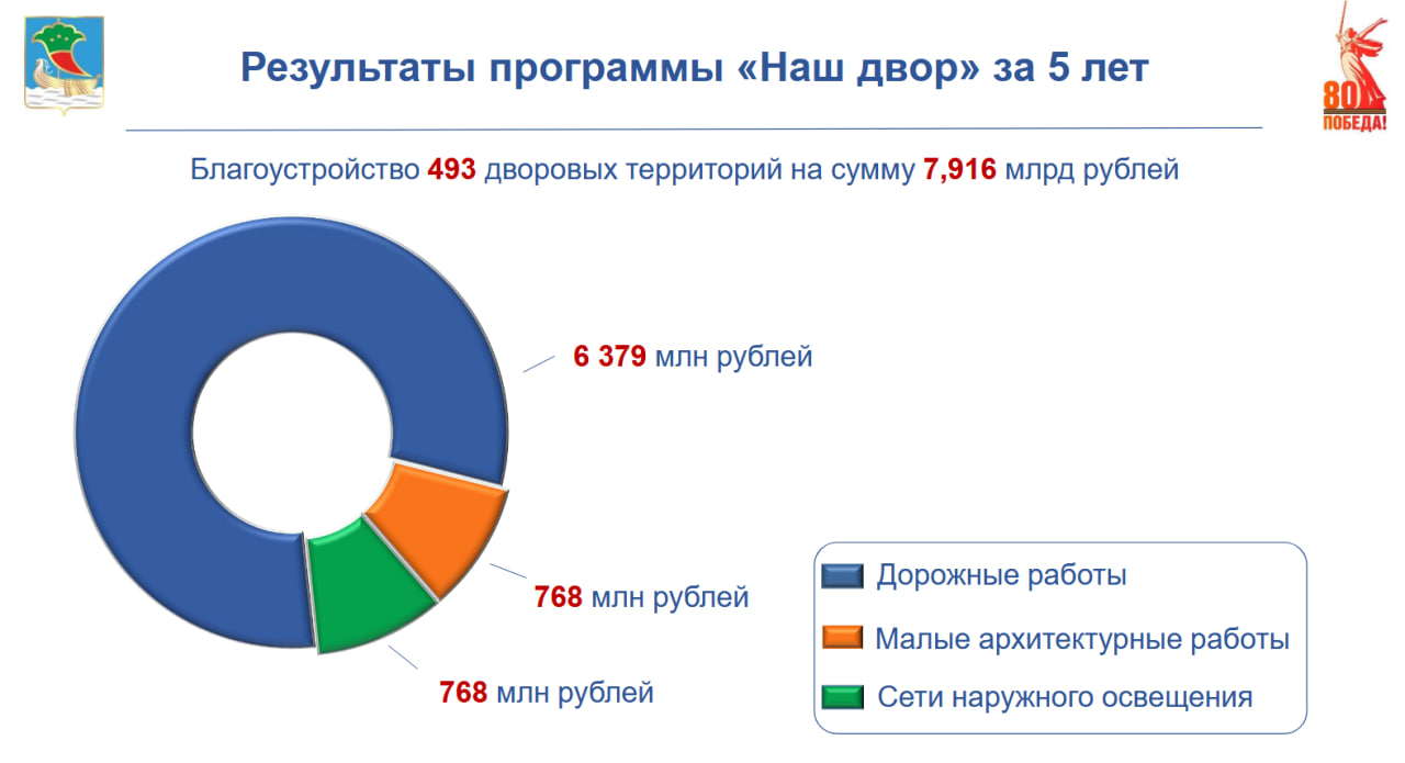 Отремонтировали более 2 млн кв.м дорог и тротуаров на сумму 6,4 млрд рублей и заменили сети наружного освещения на сумму 768,3 млн рублей, а также произведен монтаж детского, спортивного и уличного оборудования.
