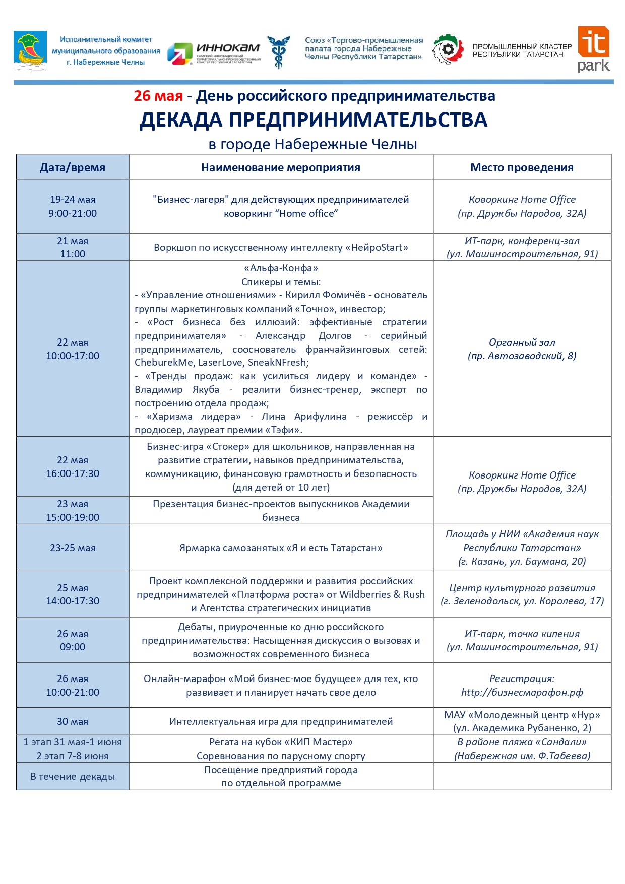 Программа мероприятий «Декады предпринимательства» охватывает различные форматы активности, направленные на поддержку малого и среднего бизнеса, развитие предпринимательской культуры и вовлечение молодежи в сферу экономики. В рамках федерального проекта «Малое и среднее предпринимательство и
