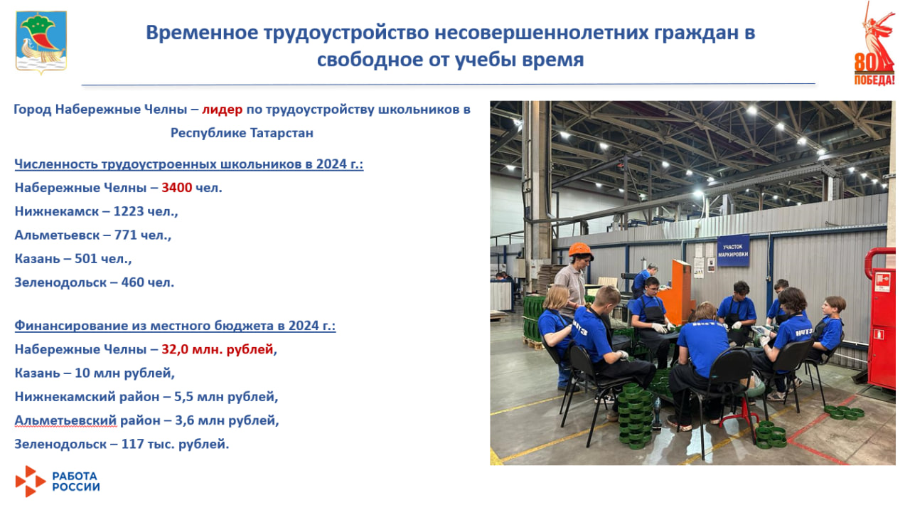 Среди организаций, успешно ведущих деятельность в сфере трудоустройства несовершеннолетних, стоит отметить предприятия: подразделения ПАО «КАМАЗ»: Прессово-рамный завод, Завод Двигателей, Автомобильный завод, Филиалы «ТАТЭНЕРГО»: Набережночелнинская ТЭЦ и Нижнекамская ГЭС, Торговый дом Кориб, «Камазжилбыт», «Сетевая компания» филиал Набережночелнинские электрические сети, «Парк культуры и отдыха», «Горкоммунхоз» и другие