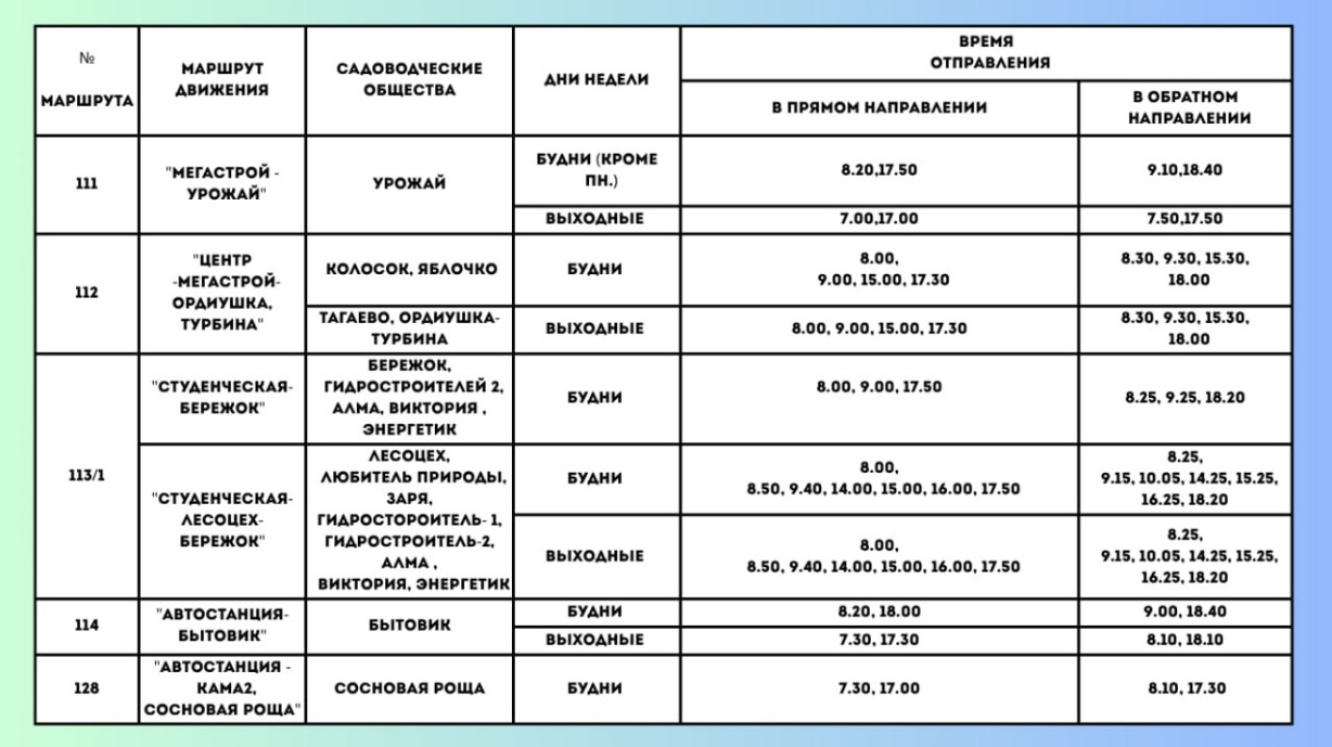 6 июня, в связи с праздником Курбан-байрам, автобусы в сады и огороды будут выходить по графику выходного дня. Представляем расписание движения автобусов.