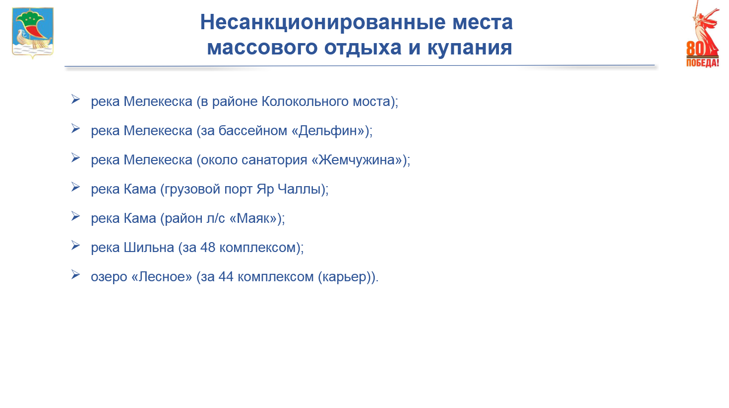 Яр Чаллы шәһәрендә су коенырга ярамаган урыннарны әйттеләр. Алар: Мәләкәс елгасы (Кыңгыраулы күпер, «Дельфин» бассейны арты, «Жемчужина» санаторие яны), Кама елгасы (Яр Чаллы йөк порты, «Маяк» көймә станциясе районы), 48 нче комплекс артында Шилнә елгасы һәм кондызлы күл (44 комплекс арты – карьер).