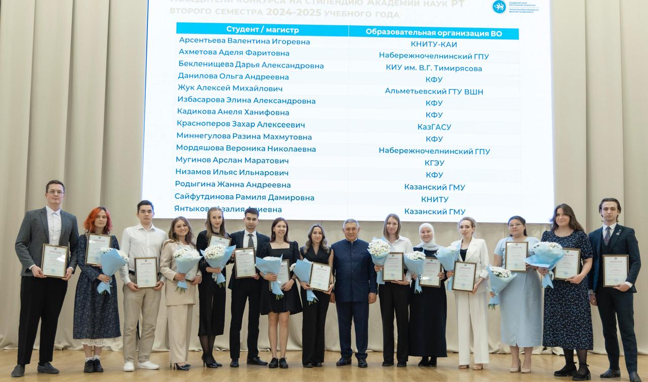 В Казани состоялась торжественная церемония награждения победителей конкурса на стипендию Академии наук Республики Татарстан за второй семестр 2024-2025 учебного года.