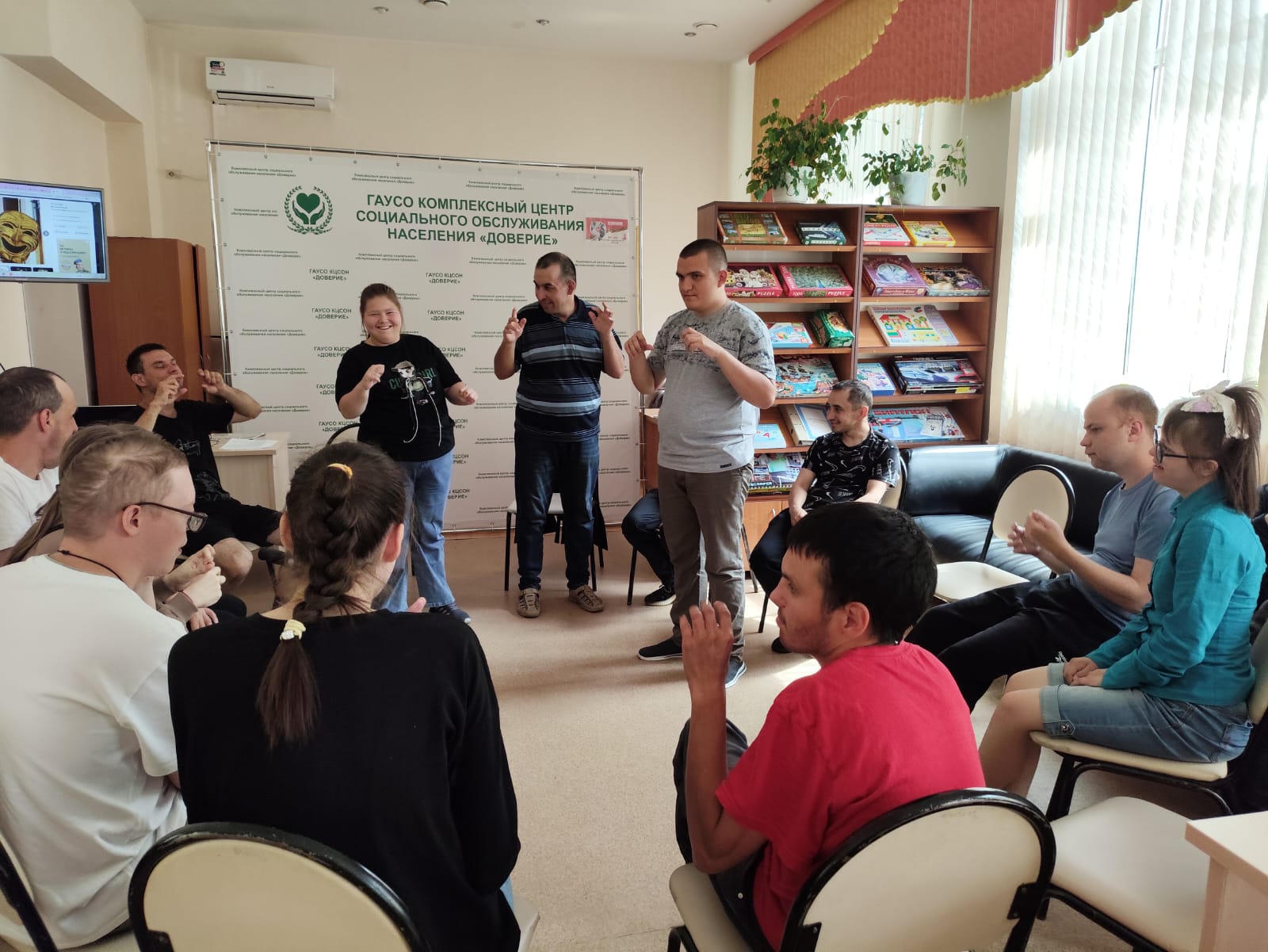 В Набережночелнинском центре социального обслуживания населения «Доверие» прошло занятие по театральному мастерству для получателей социальных услуг. Мероприятие было направлено на развитие мимики у людей с ограниченными возможностями здоровья и проходило в рамках национального проекта «Семья» и Года защитника Отечества.