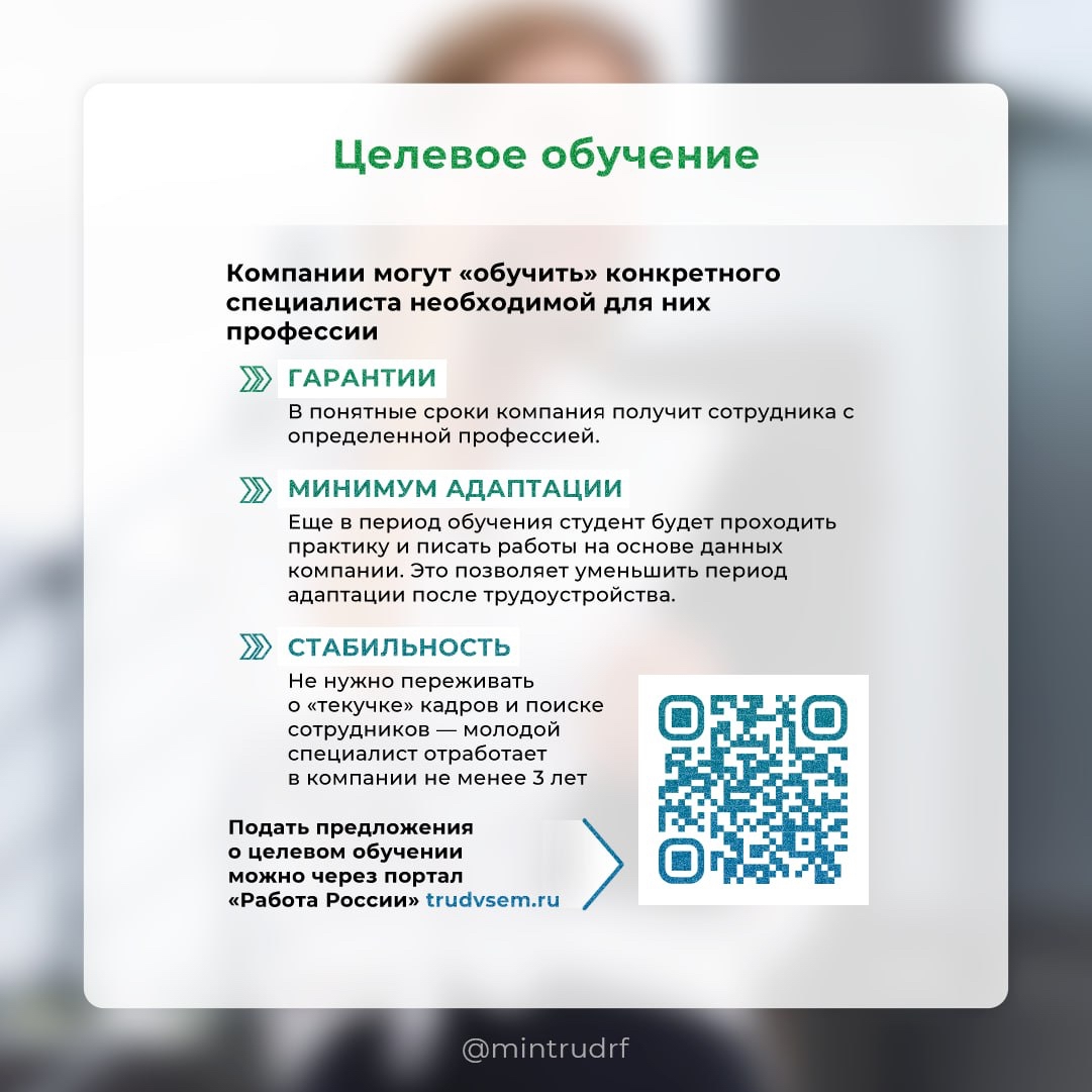 В рамках целевого обучения компании могут обучить конкретного специалиста необходимой для него профессии. В период обучения студенты могут пройти практику. Это позволяет быстро адаптироваться в коллективе компании.
