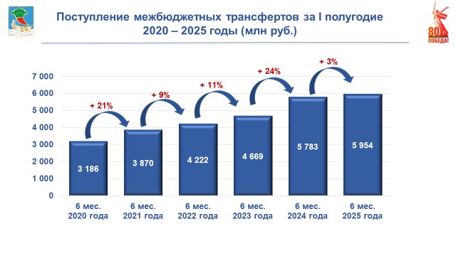 Важным фактором роста доходов бюджета города является увеличение объема межбюджетных трансфертов. За 6 месяцев 2025 года в бюджет города в виде межбюджетных трансфертов от вышестоящих бюджетов поступило 5 млрд 954 млн рублей. Прирост составил три процента.