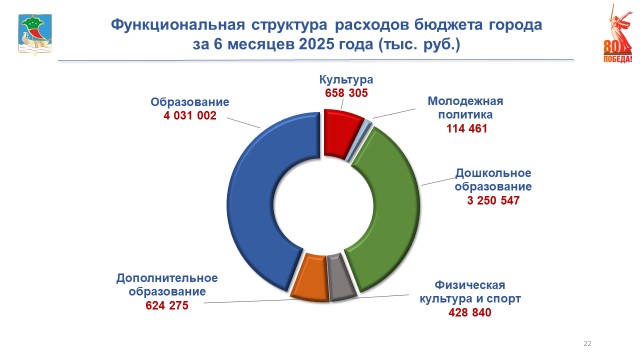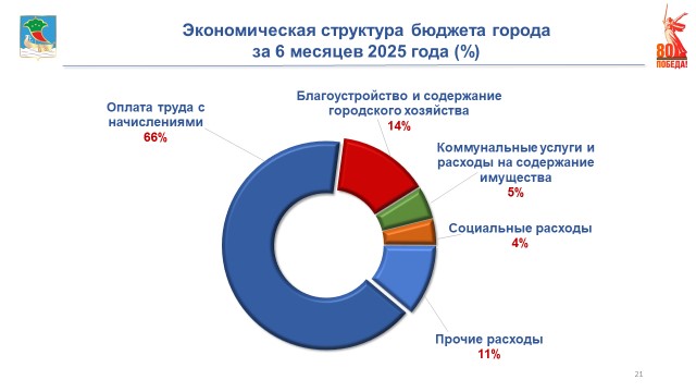 Расходы бюджета города за 6 месяцев составили 11 млрд 816 млн рублей. Основная доля расходов – 66% в экономической структуре приходится на выплату заработной платы, 14% – на благоустройство и содержание городского хозяйства, 5% – на оплату коммунальных услуг и на содержание имущества муниципальных учреждений, 4% – на социальные расходы (на организацию питания детей в дошкольных и общеобразовательных организациях, на финансирование компенсационных выплат части родительской платы, на выплаты опекунам на содержание детей-сирот и детей, оставшихся без попечения родителей и на обеспечение жильем молодых семей), 11% – на прочие расходы (осуществление обязательных платежей, обеспечение материально-технической базы муниципальных учреждений, прочие услуги муниципальных учреждений).