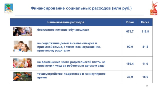 За 1 полугодие 2025 года на социальную политику выделено 466,7 млн рублей: на организацию бесплатного питания детей военнослужащих СВО, учеников 1-4 классов, детей с ограниченными возможностями здоровья и из многодетных семей – 317 млн, на содержание детей в семье опекуна и приемной семье, а также вознаграждение, приемному родителю – 97 млн, на возмещение части родительской платы за присмотр и уход за ребенком в детском саду – 11 млн, трудоустройство подростков в каникулярное время15 млн рублей.