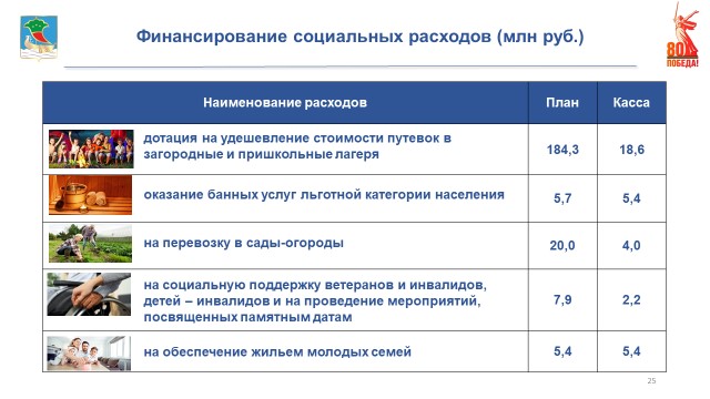 В числе социальных расходов: дотация на удешевление стоимости путевок в загородные и пришкольные лагеря и предоставление бесплатных путевок для детей участников в специальной военной операции - 19 млн рублей, оказание банных услуг льготной категории населения – 5,4 млн, перевозка в сады-огороды – 4 млн, социальная поддержка ветеранов, инвалидов, детей-инвалидов и на проведение мероприятий, посвященных памятным датам, – 2 млн, обеспечение жильем молодых семей – 5,4 млн.