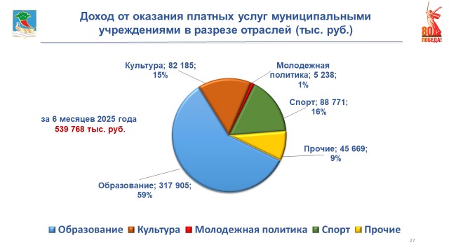 За отчетный период доход от оказания платных услуг муниципальными организациями получен в сумме 540 млн рублей. Средства, полученные от внебюджетной деятельности, направлены на увеличение размера заработной платы работников и содержание имущества учреждений.