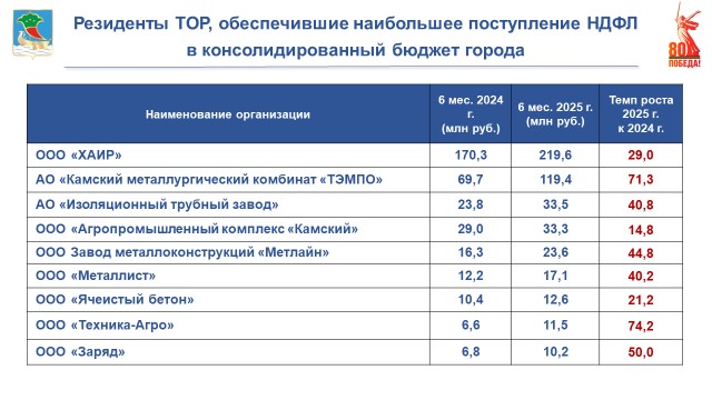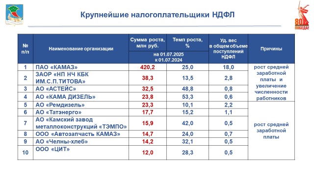 Десятку резидентов ТОР, обеспечивших наибольший удельный вес в платежах налога на доходы физических лиц, а также рост платежей в абсолютных цифрах к аналогичному периоду прошлого года, возглавляют компании «ХАИР», «ТЭМПО», «Изоляционный трубный завод». Главный финансист города отметила, что ежегодно наблюдается рост поступлений НДФЛ от резидентов территории опережающего развития: «В консолидированный бюджет Республики Татарстан резидентами территории опережающего развития налог на доходы физических лиц перечислен в сумме 792 млн рублей. Поступления в бюджет города от резидентов составили 217 млн рублей, с ростом к прошлому году на 43 млн рублей».