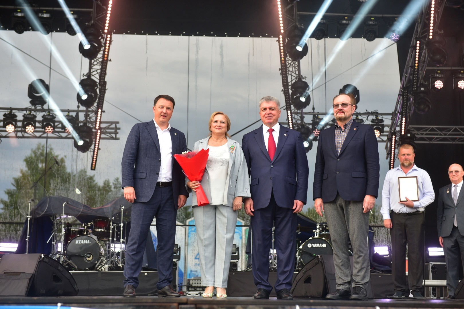 Празднование Дня строителя на майдане парка Прибрежный продолжается. На сцене   мэр города Наиль Магдеев, министр строительства, архитектуры и жилищно-коммунального хозяйства Республики Татарстан Марат Айзатуллин, начальник Главгосэкспертизы Игорь Манылов.