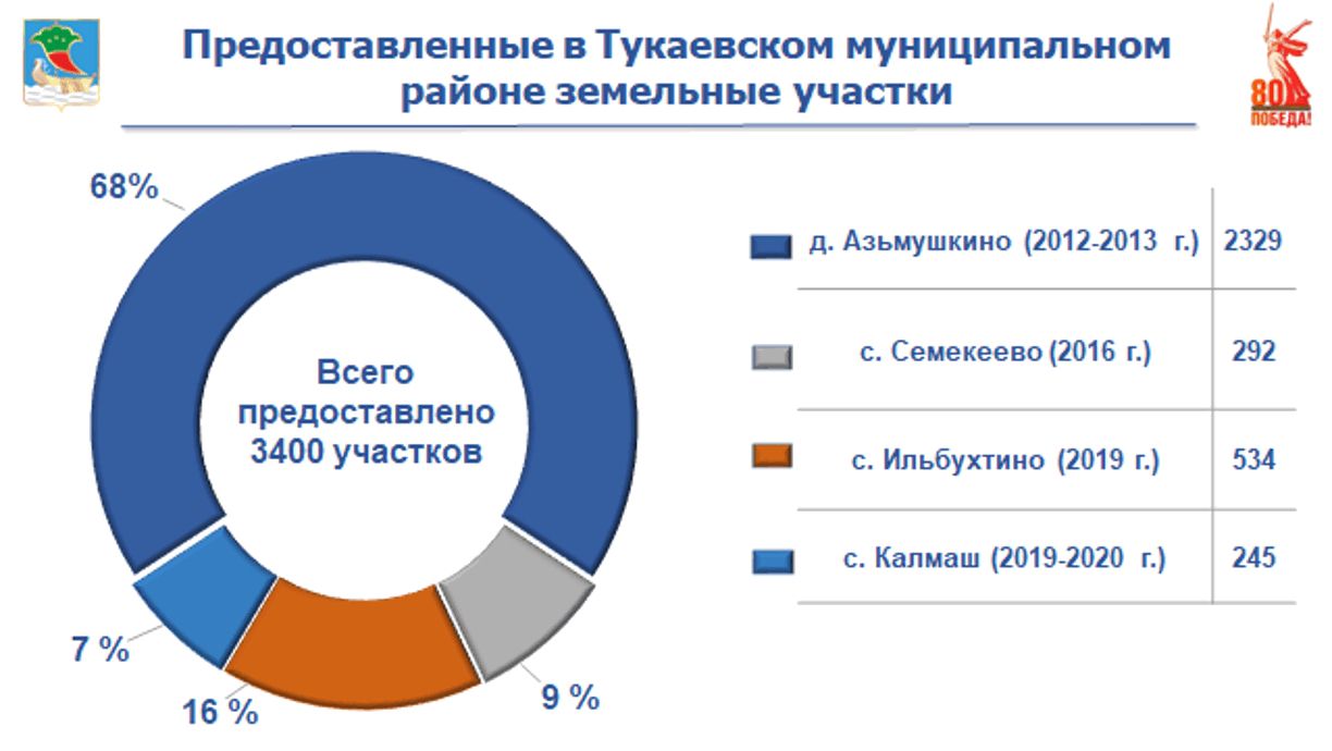 Напомним, что имеющиеся земельные участки ранее были выделены в Тукаевском районе: Азьмушкино, микрорайон «Подсолнухи» (площадью 300 га, размежевано для индивидуального жилищного строительства (далее – ИЖС) 2 328 участков, 2012-2013 года), село Семекеево (площадь 34 га, для ИЖС 292 участка, 2016 год), село Ильбухтино, Малошильнинское сельское поселение (общая площадь 101,1 га, 535 участков, 2019-2020 гг.), село Калмаш (площадь 30 га, 245 участков, 2019-2020 гг.).