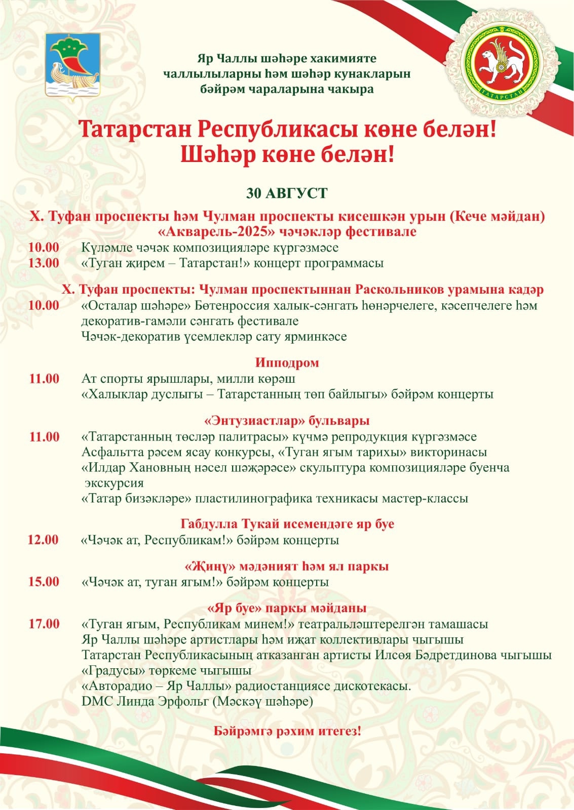 С 12:00 на набережной имени Габдуллы Тукая в посёлке ГЭС стартует концерт дома культуры «Энергетик». Библиотеки и музеи организуют тематические выставки и мастер-классы, посвящённые культуре и истории города.