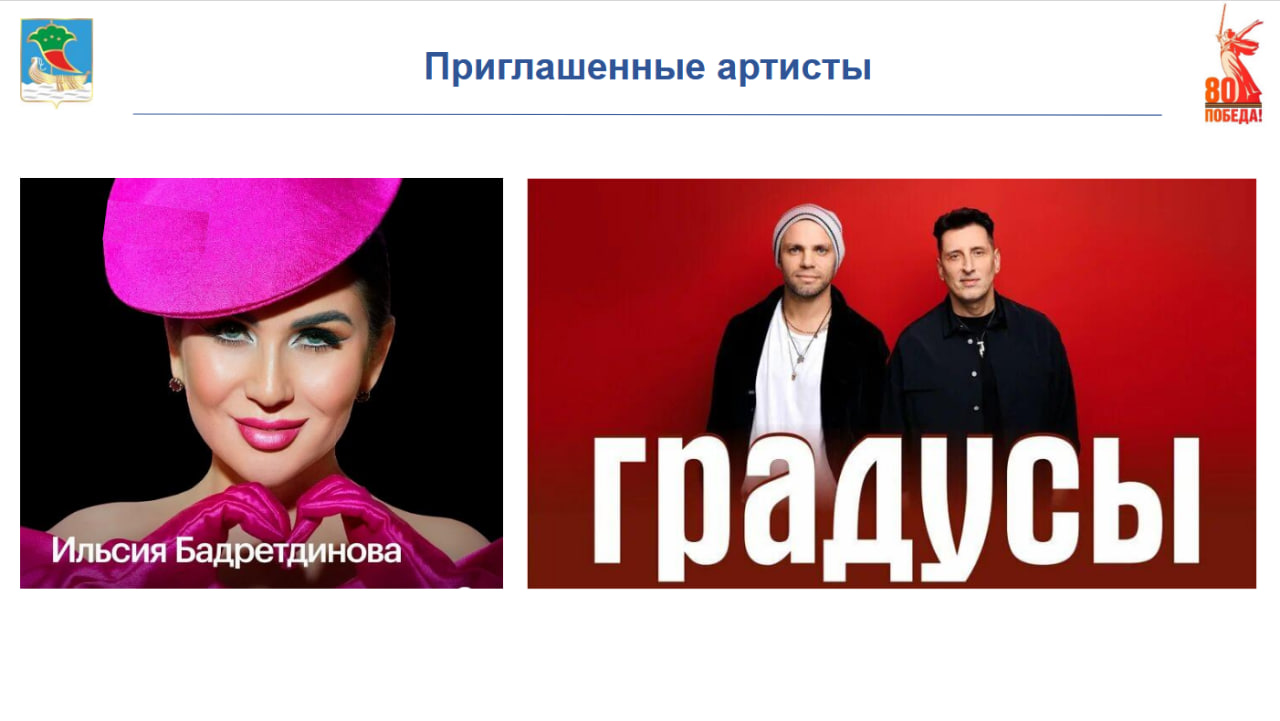 Праздничный вечер завершится выступлением артистов города, заслуженной артистки Республики Татарстан Ильсии Бадретдиновой, группы «Градусы», диджея Линды Эрфольг и праздничным салютом в 21:00.