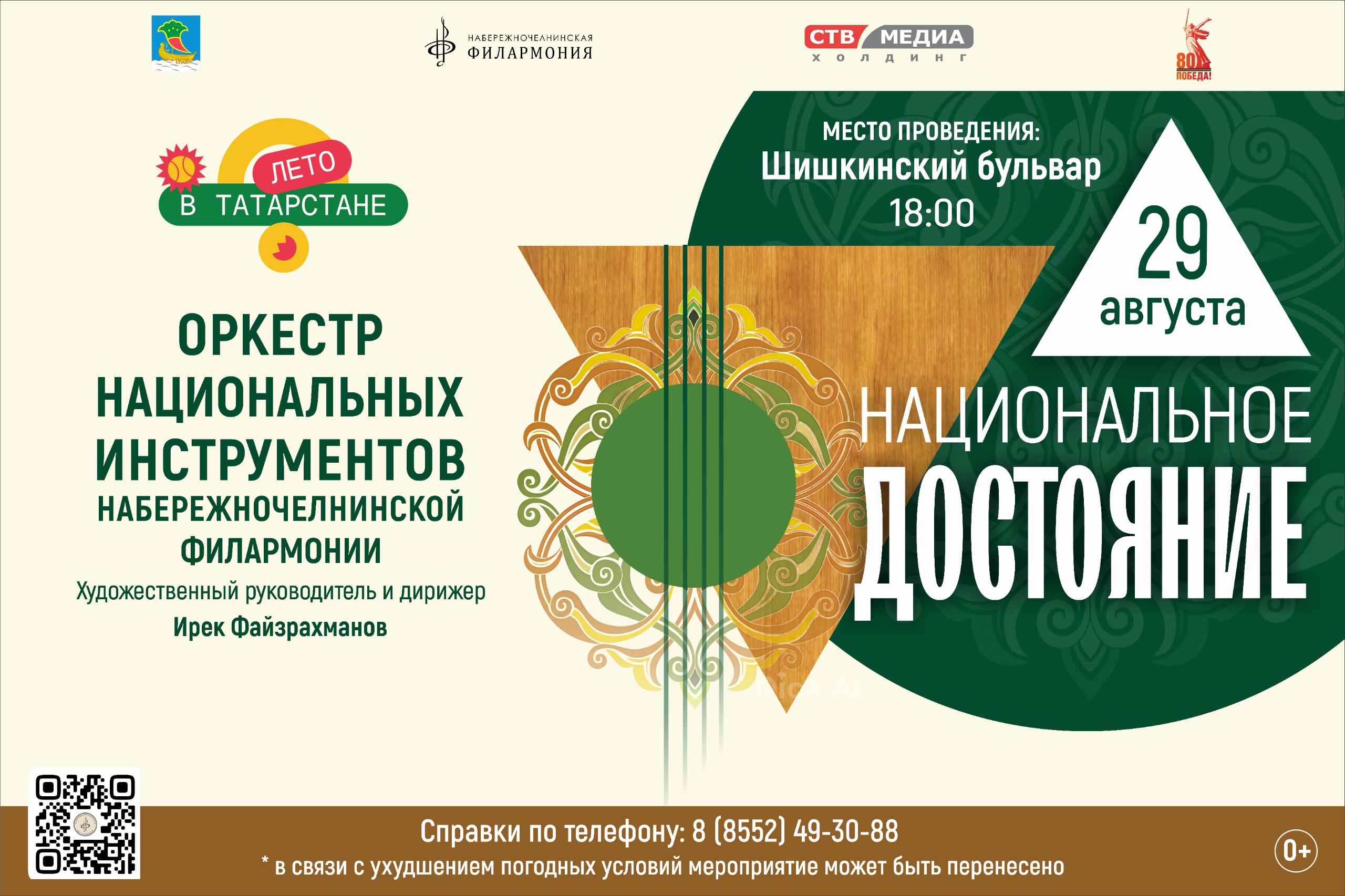 29 августа на территории Шишкинского бульвара под открытым небом состоится концерт оркестра национальных инструментов Набережночелнинской филармонии под руководством художественного руководителя и дирижера Ирека Файзрахманова.