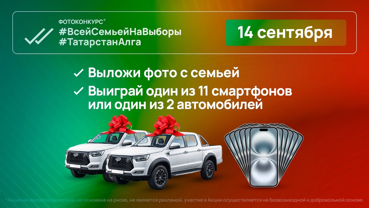 14 сентября, в день проведения выборов Раиса Татарстана и муниципальных депутатов, пройдет фотоконкурс #ТатарстанАлга #ВсейСемьейНаВыборы. По его итогам можно выиграть автомобиль или смартфон.