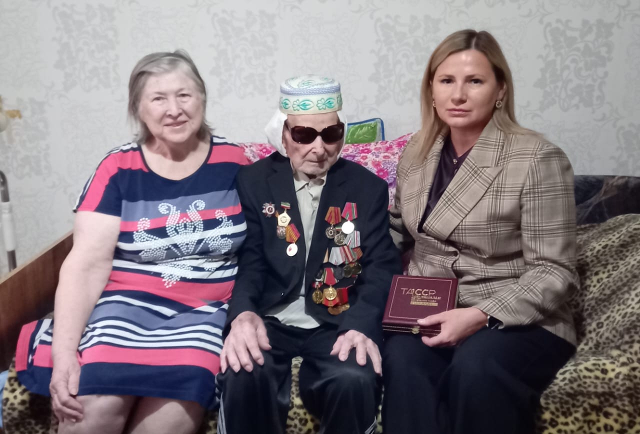 Заместитель главы муниципального образования города Ирина Сагидуллина вручила награду участнику Великой Отечественной войны Мухтасиму Фарукшину, отметившему в этом году 100-летний юбилей.