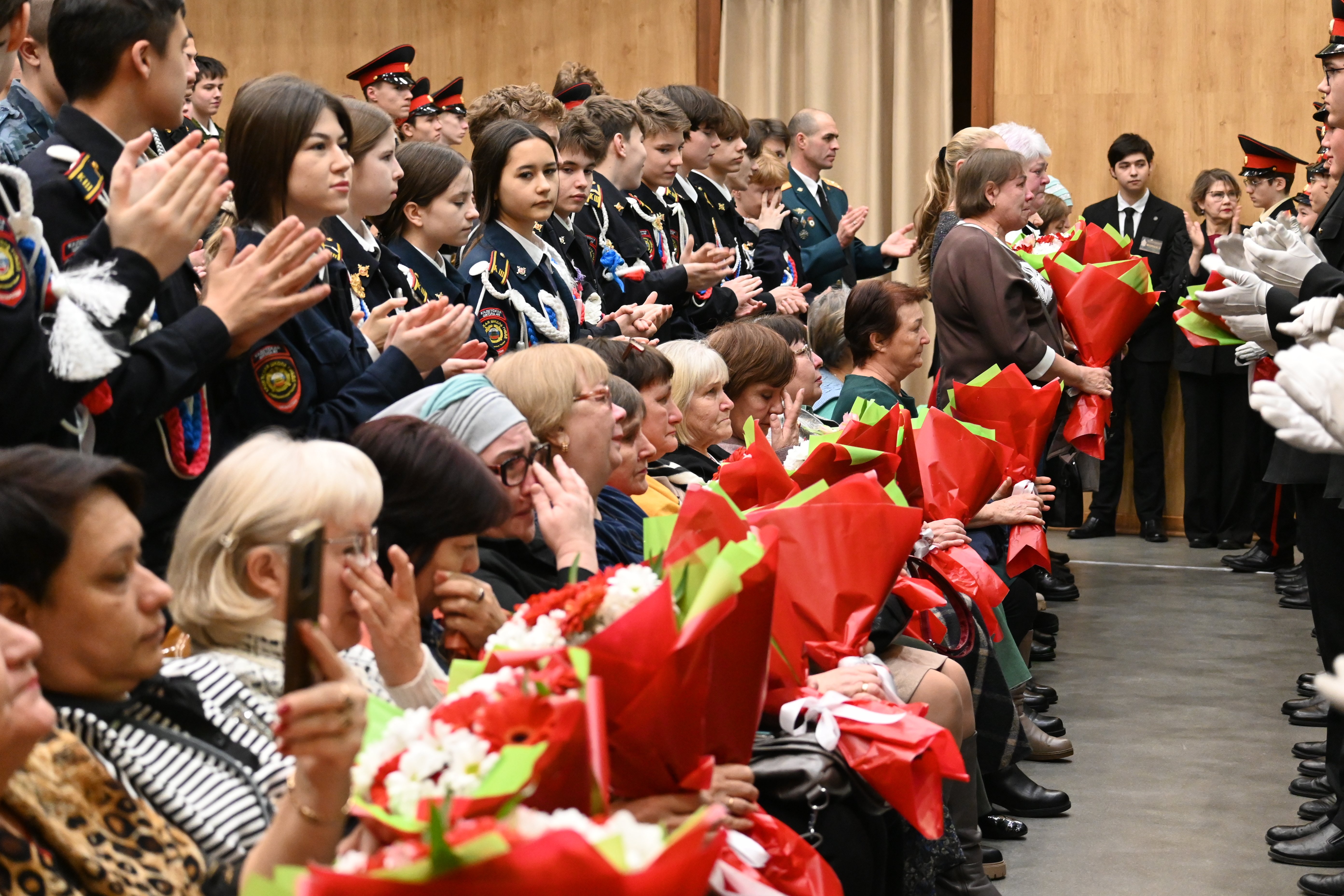 Торжественное мероприятие продолжилось в концертном зале: под оглушительные овации кадеты вручили букеты матерям наших Героев. Зал аплодировал стоя.