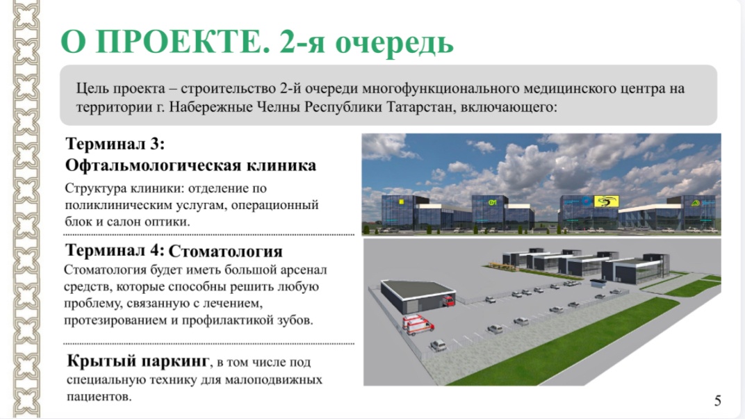 Первый инвестиционный проект из Набережных Челнов предусматривает строительство второй очереди многофункционального медицинского центра "МЕД+". Челнинская компания планируют возвести вторую очередь медицинского центра, который будет включать новые терминалы: офтальмологическую клинику и стоматологию к уже имеющимся терминалам: центру восстановительной медицины и лечебно-диагностическому центру. Для этого была озвучена просьба выделить земельный участок в аренду без проведения торгов.