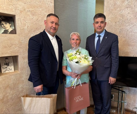 Бөек Ватан сугышы ветераны, фашист лагерьларының балигъ булмаган элеккеге тоткыны Вера Ивановна Хлюзова котлаулар кабул итә.
