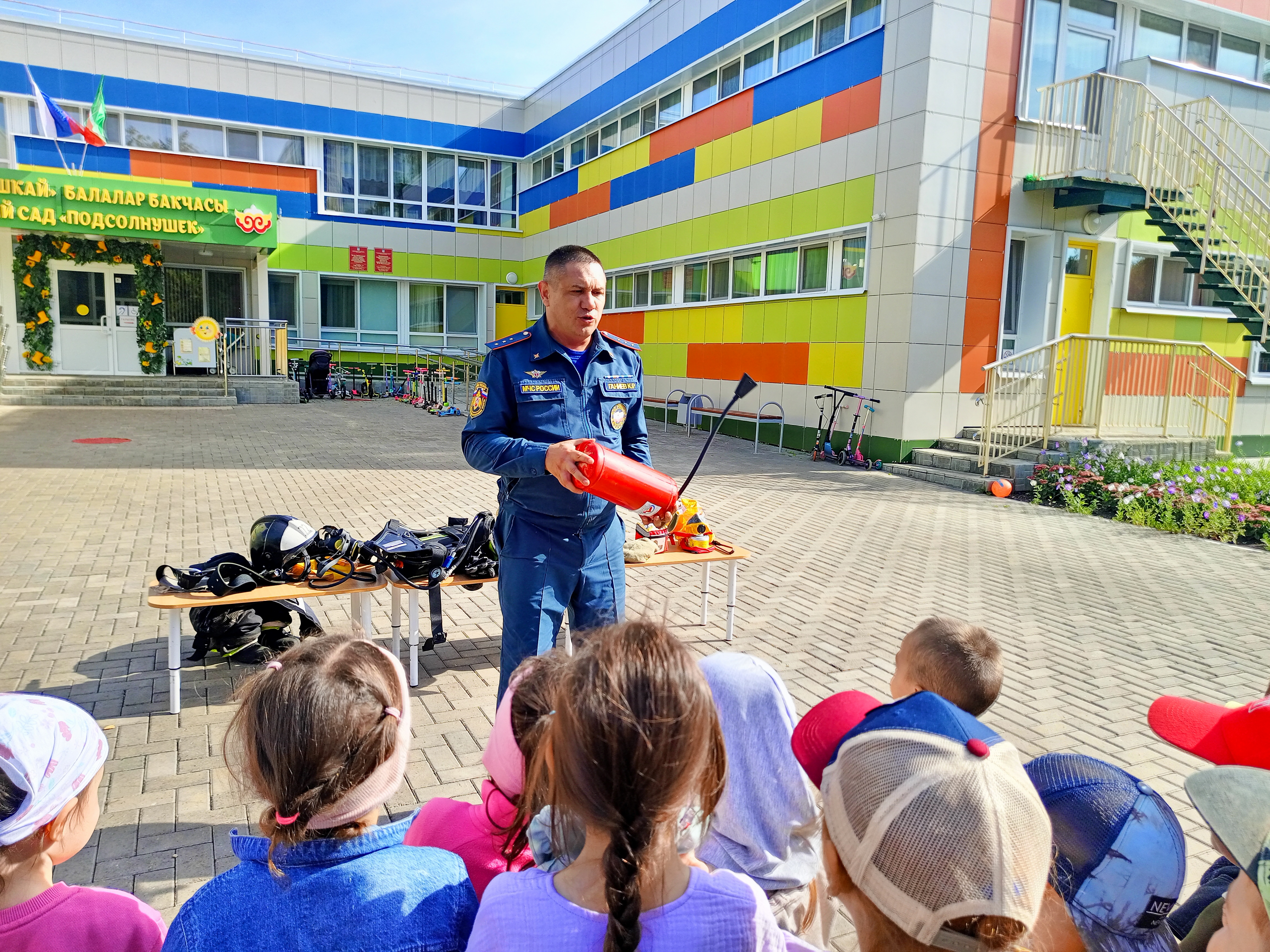 «Көнбагышкай» 82 нче балалар бакчасында чара узды. Алар янына МЧС хезмәткәре килде.