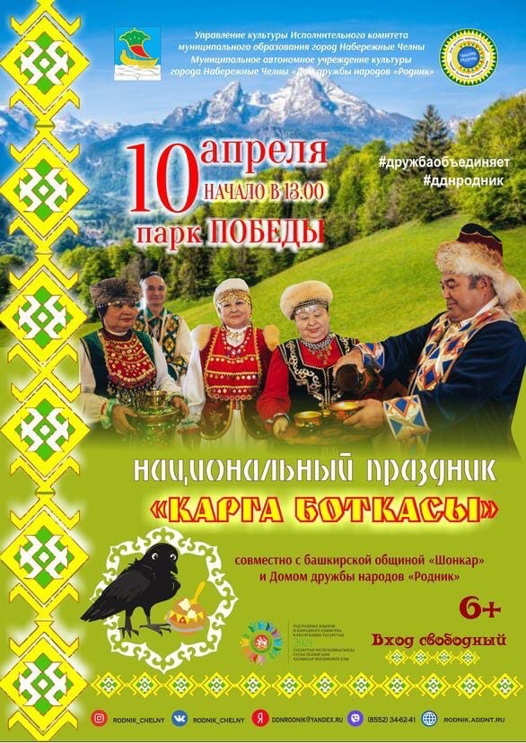 В Набережных Челнах 10 апреля в 13:00 в парке «Победа» состоится национальный праздник «Карга боткасы». В празднике участвует башкирская община «Шонкар» совместно с Домом Дружбы народов «Родник» при поддержке управления культуры Исполнительного комитета города Набережные челны.