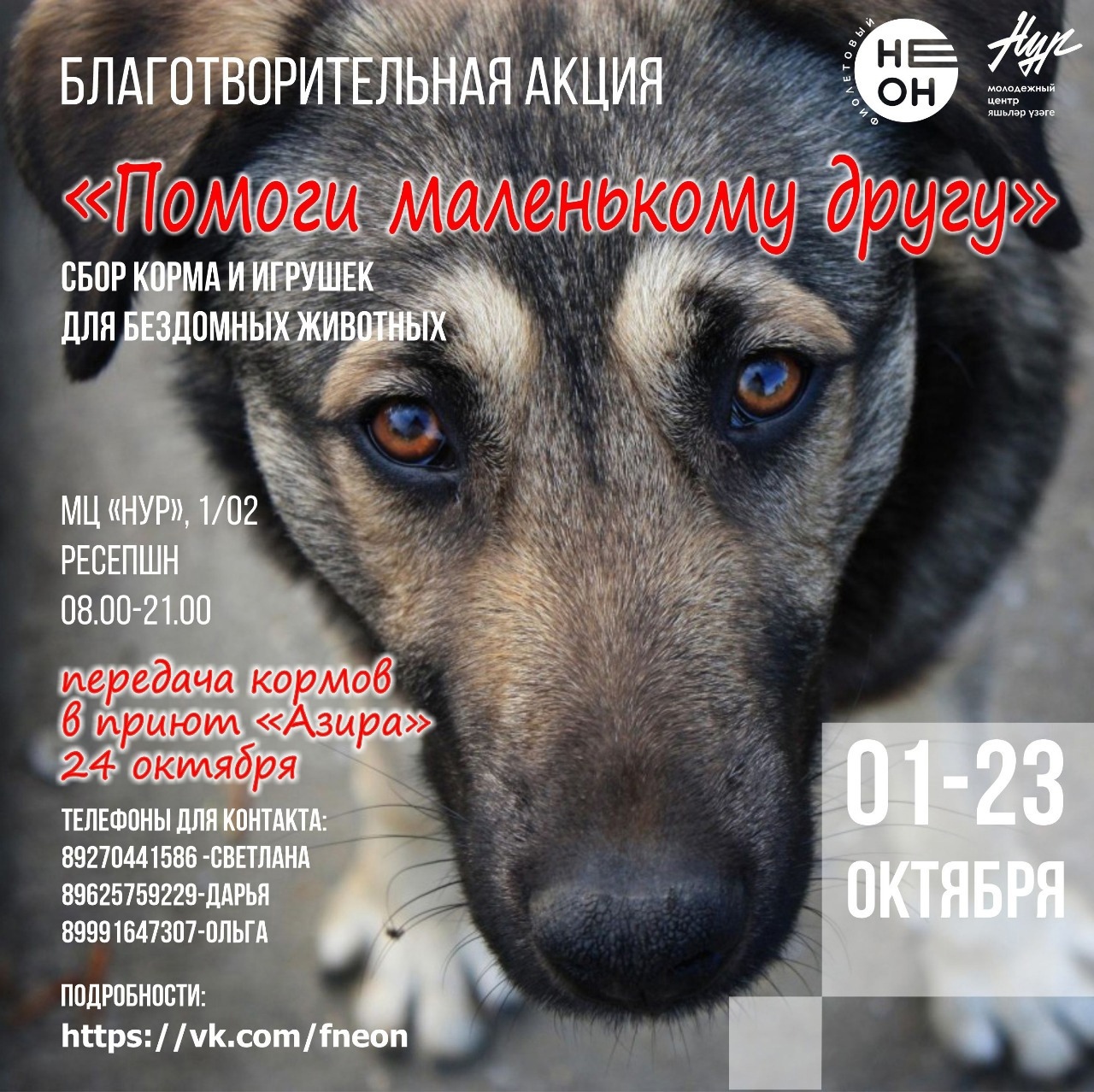 Челнинцев приглашают принять участие в ежегодной благотворительной акции «Помоги маленькому другу». Сбор кормов проходит с 1 по 23 октября. В приют "Азира" собранные корма будут переданы 24 октября.