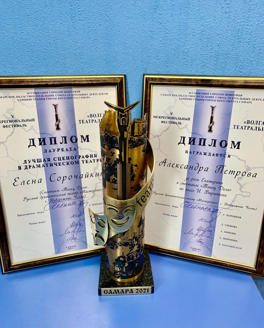 В Самаре завершился Межрегиональный фестиваль «Волга театральная». У русского драматического театра “Мастеровые” – две награды. Наград удостоен спектакль «Танец Дели» по пьесе И.Вырыпаева в постановке Александры Джунтини. Приз "За лучшую сценографию в драматическом театре" получила главный художник театра Елена Сорочайкина. Специальный приз жюри за роль Екатерины у Александры Петровой.