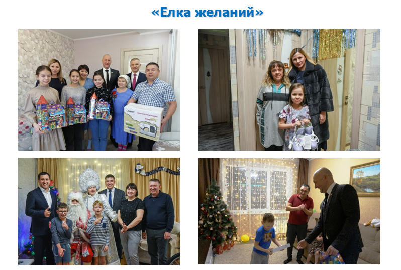 Доброй традицией стали благотворительные акции, проводимые в рамках Всероссийского проекта «Елка желаний». Так, депутаты Государственного Совета РТ и Городского Совета исполнили мечты 50 ребят. Благотворительную акцию на протяжении декабря проводил молодежный центр «Нур». В итоге были собраны подарки для 250 детей, которые встретили Новый год в стенах больниц.