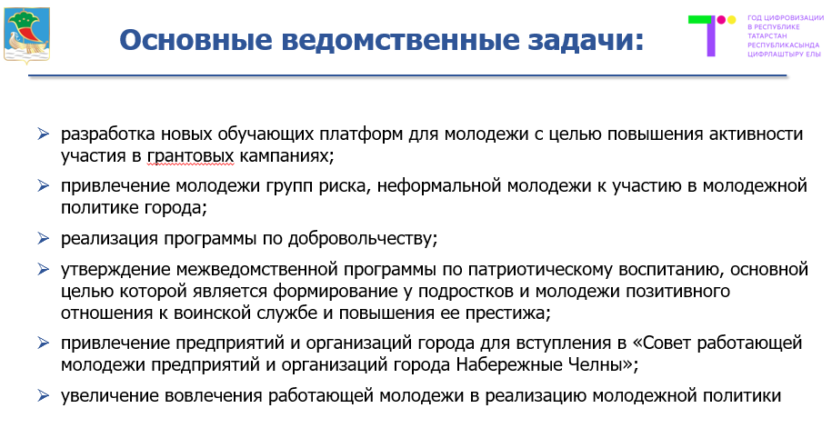 Она отметила, что государственная молодёжная политика Республики Татарстан признана лидером по эффективности в рейтинге регионов России, а в рейтинге муниципалитетов республики с населением свыше 120 000 человек город Набережные Челны по итогам прошлого года занял первое место.
