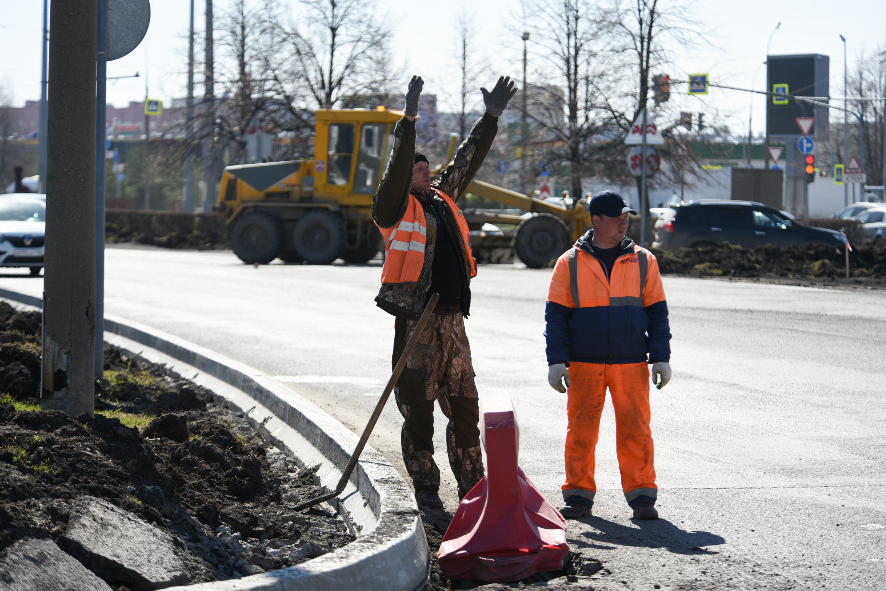 Глава города обратил внимание дорожников на состояние дороги и сделал замечание, что бортовой камень, грунт необходимо будет убрать.