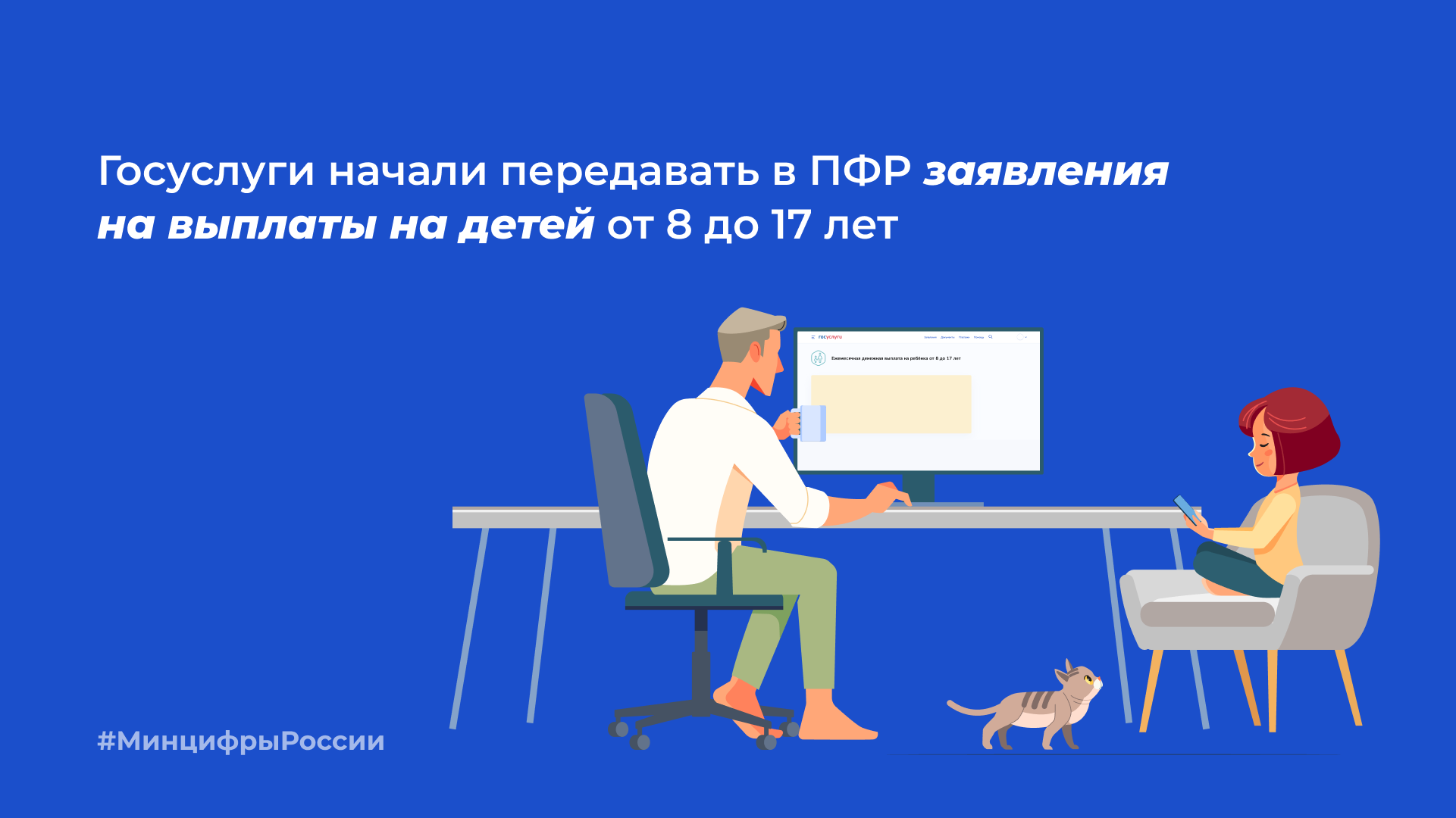 С 1 мая Госуслуги начали передавать в ПФР заявления пользователей для оформления новых выплат на детей от 8 до 17 лет. Возможность заполнить и отправить заявление доступна на портале с 26 апреля, а с 1 мая — также при личном визите в МФЦ и клиентские службы ПФР. В настоящий момент заявки подали более 1 млн родителей — они уже автоматически отправлены в ПФР.
