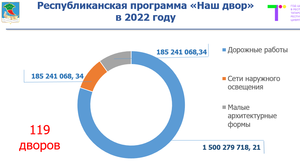 В настоящее время дорожные работы ведутся в 60 дворах (117 домов), в 9 дворах дорожные работы завершены, выполнение составляет 37%. Работы по освещению ведутся в 21 дворе, в 30 дворах работы уже завершены, выполнение составляет 39 %.