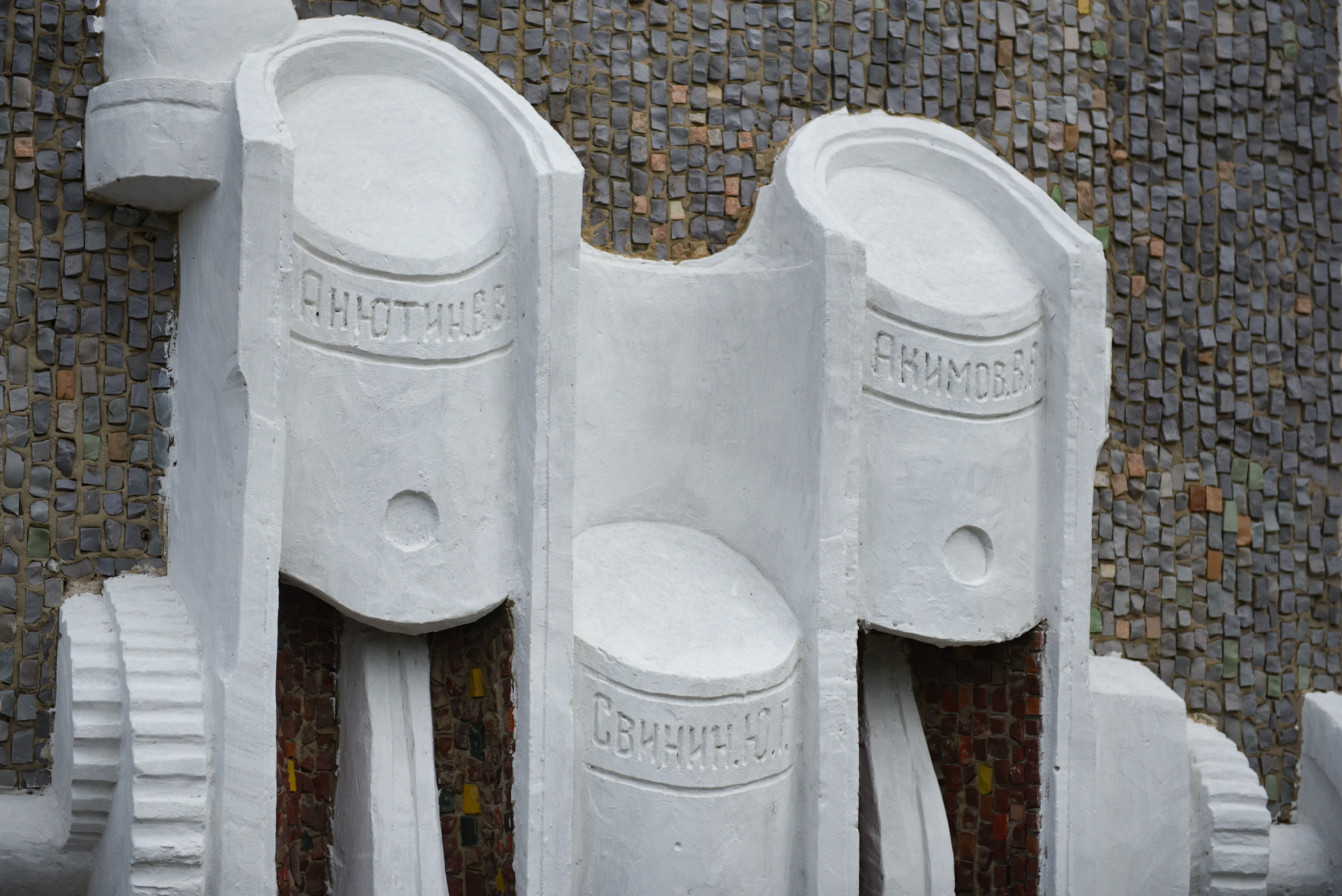 На мозаике расположен объемный коленчатый вал с поршнями, где указаны имена авторов.