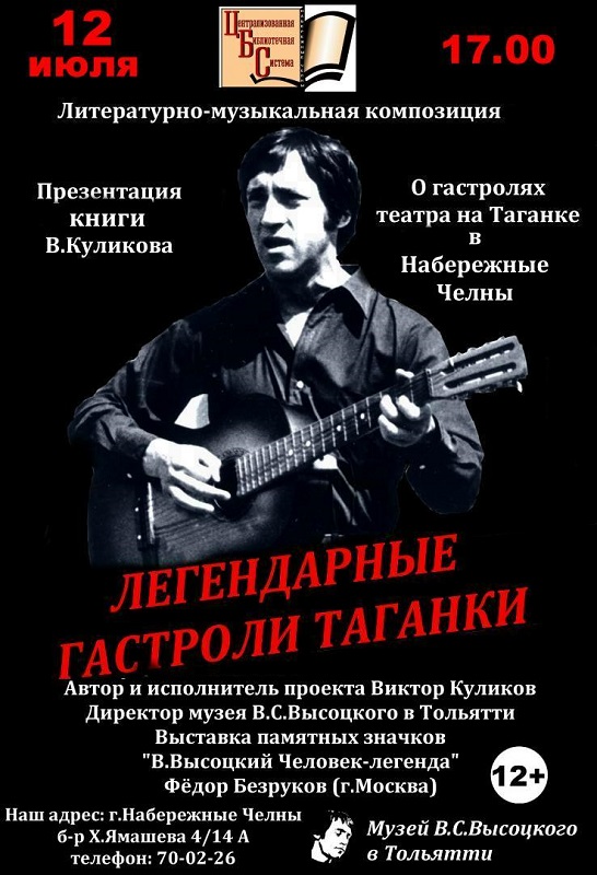 12 июля в 17.00 в Центральной городской библиотеке состоится презентация книги Виктора Куликова «Легендарные гастроли Таганки», рассказывающей о гастролях театра в Набережные Челны в июне 1974 года.
